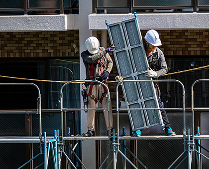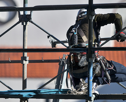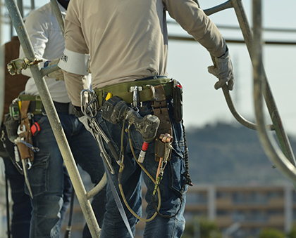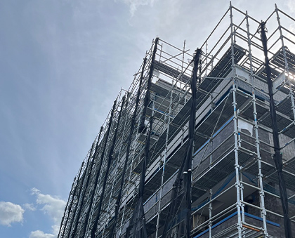 現場では足場の組立て等作業主任者の資格をもつスタッフが安全を徹底し、丁寧かつ正確な施工を行っています。